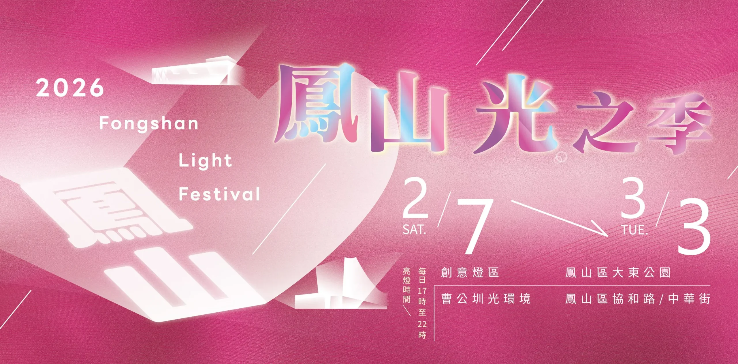 今年燈會以鳳山大東公園為主軸並串聯曹公圳中華街、協和路,打造10組創意燈飾及10處光環境。大東公園入口處主燈《我愛鳳山》高達8公尺,兩隻鳳凰相互凝視隱含「鳳山城心型」輪廓,巧妙融入鳳山特有的丘陵地景輪廓與曹公圳百年不息的水文意象。其餘9組燈飾作品亦展現豐富多元的光影樣貌,並搭配10組光環境,邀您夜間漫步於鳳山水岸,感受光影交織的浪漫情懷。