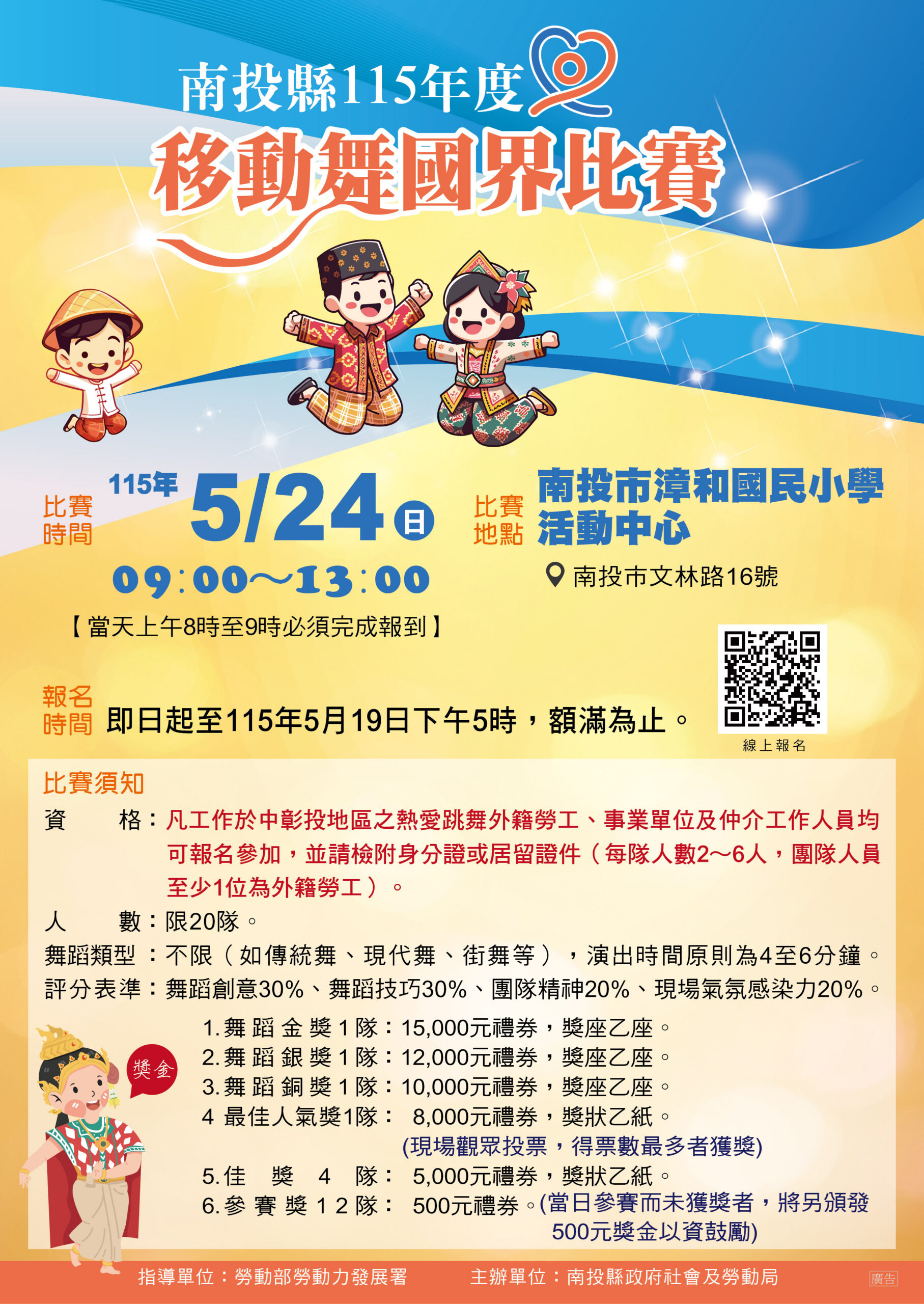本活動獎項非常豐厚,活動獎項最高1萬5千元禮劵,總獎金額高達7萬1千元,歡迎有興趣之移工朋友踴躍報名參加,也鼓勵雇主及仲介單位協助推薦與參與,並一同賞舞及投票給予參賽者支持,共同打造一場充滿熱情與國際風情的舞蹈盛會。報名方式採網路報名,自即日起開放報名至115年5月19日下午5時止,額滿即提前截止,相關各國語言比賽簡章請掃QR CODE或至南投縣政府社會及勞動局社會福利資訊網「社會及勞動局社會福利資訊網-勞工福利-外國人工作管理-移工活動/其它」下載(網址: https://welfare.nantou.gov.tw/1486/24-5)。詳細活動訊息請電洽南投縣政府社會及勞動局勞工行政科049-2238670陳小姐。
