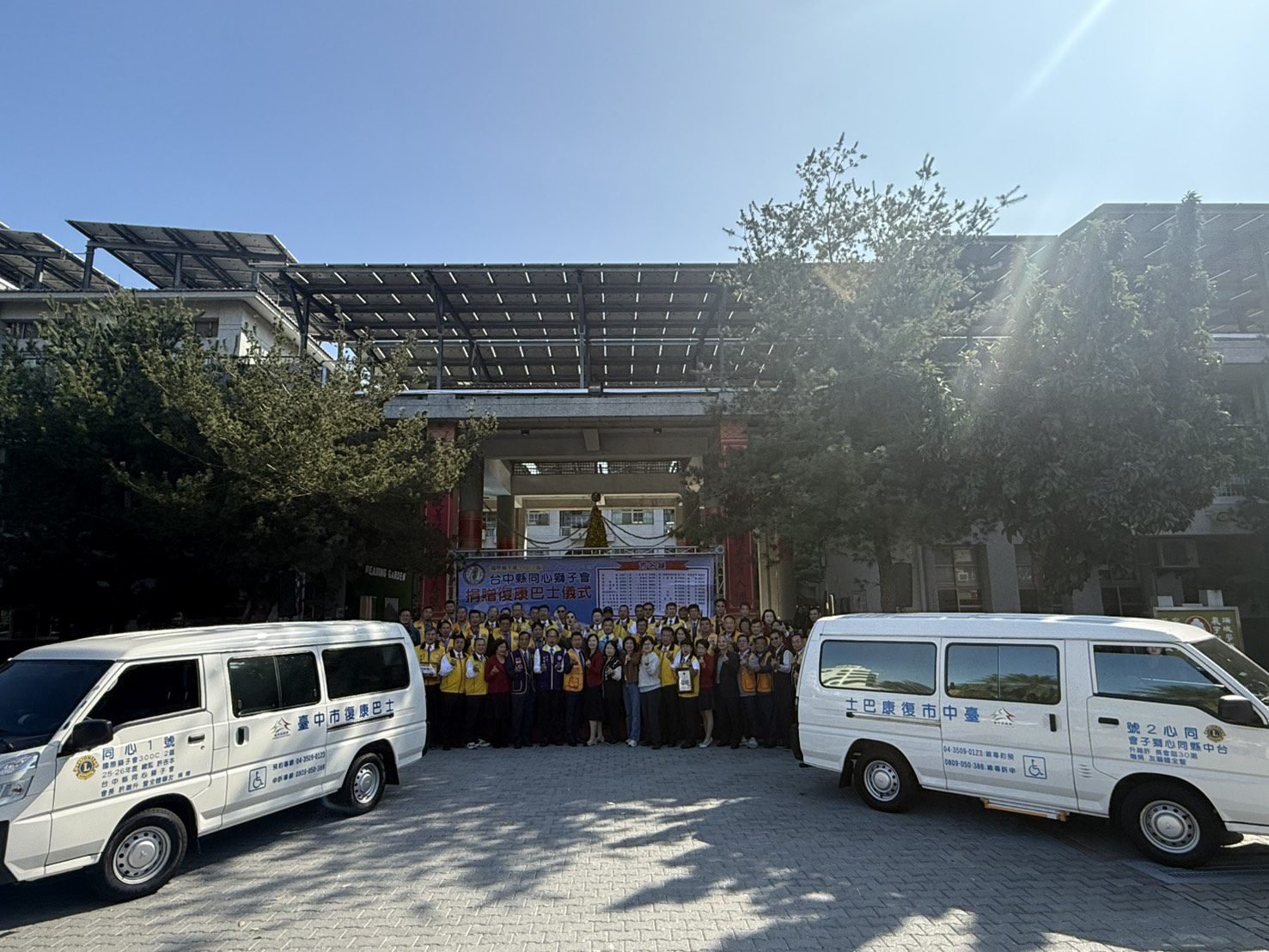 台中縣同心獅子會第30屆會長許瀚升率領獅友們,今(25)日慷慨捐贈台中市政府2輛復康巴士,未來將在大里、霧峰和東西中南區服務。社會局長廖靜芝代表受贈,感謝獅子會長期以來對台中市民的關懷與付出,身障朋友能夠安全、舒適的就醫、復健及參與社會活動。